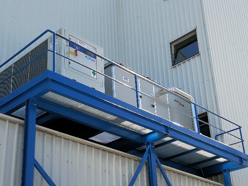 Con todos estos requerimientos se optó por un sistema de aire mediante climatizador con batería de agua y enfriadora condensada por aire. El aire frío se distribuye mediante conductos desde el climatizador, incluyendo partes flexibles para acompañar el movimiento de la prensa, y en el interior de la prensa se incluyeron difusores tipo tobera para mejorar el reparto del aire climatizado.